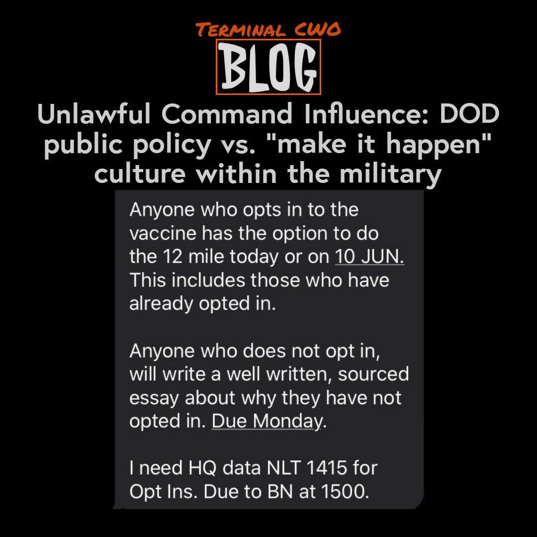 I decided against putting “Covid-19” in the title, because neither the virus nor vaccine is ultimately the issue. The issue tearing apart the fabric of our military and destroying good order and discipline, which stands as the backbone of our entire way of life, is the unlawful command influence (UCI) exerted on units from their command teams. Also referred to as “undue” command influence in a bit less of a court room drama, UCI is the act of a commander/command team applying pressure to their troops to do something they are not legally allowed to enforce through direct orders. I’ll do my absolute best to lay this out logically and hope you concur with my opinion on this.